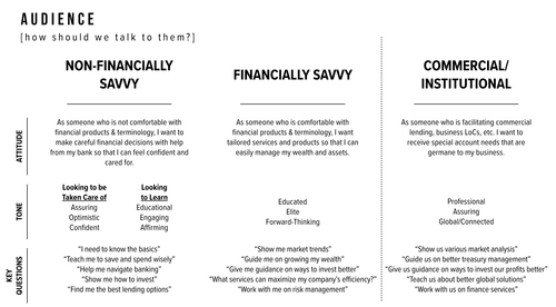 Audiences is the original persona. It gives a sense of who they are and how the brand should talk to them. In this example, we were working with a bank, so their main audiences were those who were commercial bankers and financially-savvy and non-financially-savvy consumers. Within non-financially-savvy, we also considered the fact that some people who don’t know much about banking are actually interested in learning, so we wanted to offer experiences that could help people go from being a novice to an expert.