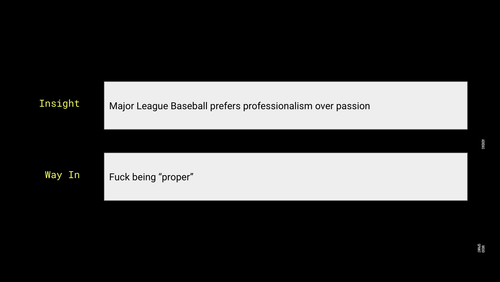 We made a video to hyperbolize the outdated view points of those who defended these “unwritten rules.” We worked with the brand to produce a t-shirt that brought to life the excitement of the player and a eulogy to the baseball we were leaving behind.